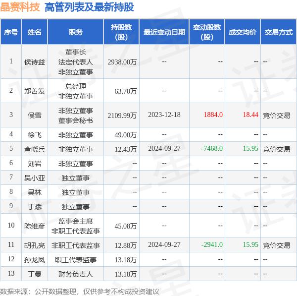 近半年来,晶赛科技董监高和核心技术人员的调整持有以下详细信息: