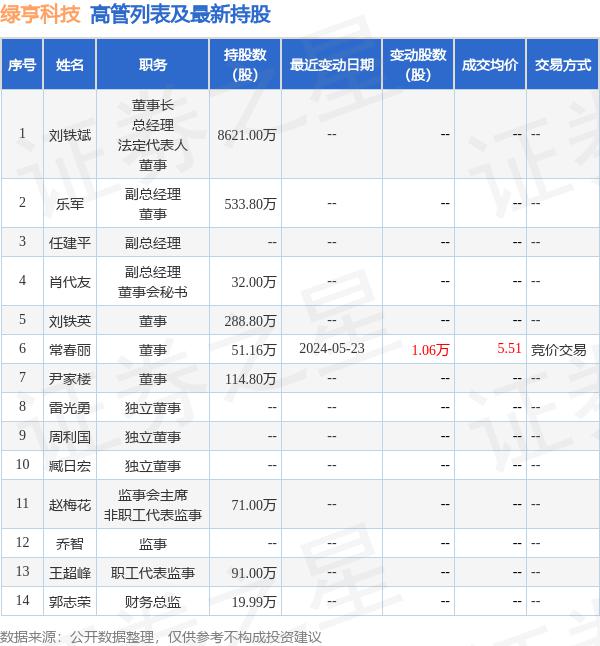 证券之星消息,依据 9 月 30 绿亨科技(870866)最新董监高及相关人员股权变动情况,日市场公开信息、上市公司公告及交易所披露数据整理:2024 年 9 月 27 日本公司高管任建平公司股权加持公司 2.18 万股,占公司总股本的一万股。 0.0121%。公司股票在变化期间上涨 6.77%,9 月 27 当天收盘报告 5.52 元。