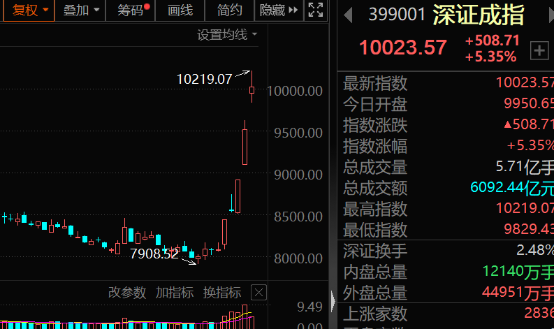 开盘时,a股市场成交量持续增长,截至10。:沪深股市成交额突破1万亿元,较前一个交易日成交量超过4100亿元,创下历史最快的万亿纪录。