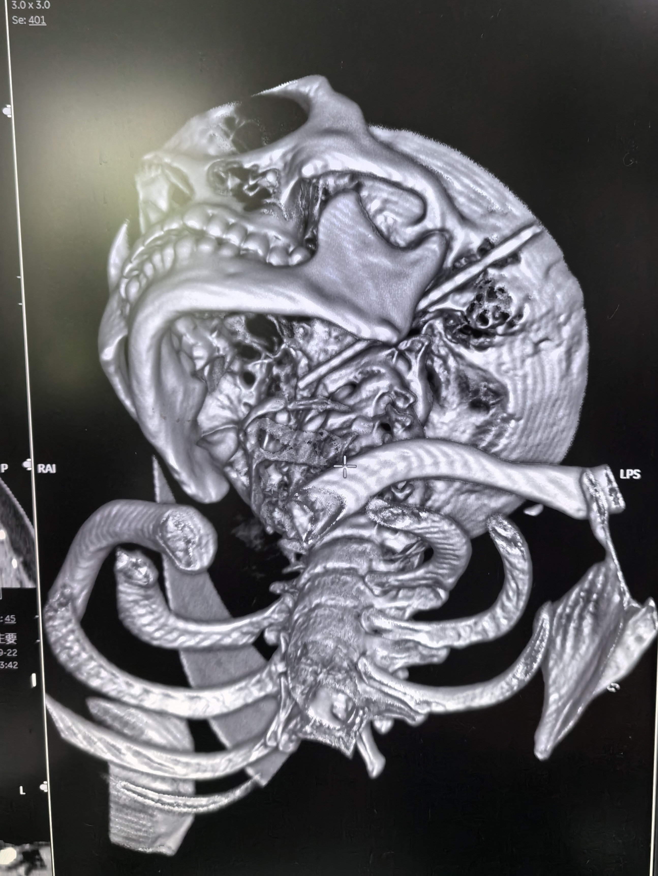 浦某的CT血管成像显示,插入面部的筷子贯穿左外耳,通过左腮腺到左咽,正好置于颈部血管交通干道-颈部内动和静脉之间,距离血管只有mm。