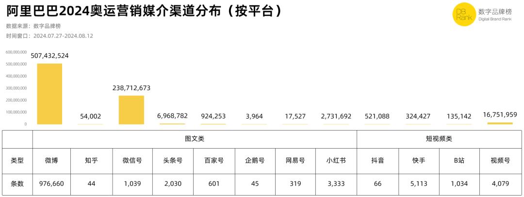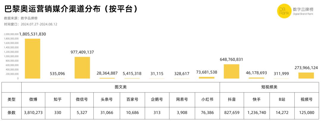 例如,在巴黎奥运会期间,微博上有4.16亿条博客,交互量达到16.98亿,题目阅读量达到4,790亿。看看品牌营销方面的数据,『数字品牌榜』根据2024年7月27日至8月12日的时间窗口,微博以3,810,273条内容贡献了1,805,531,830DB的数字品牌价值,其次是以长图文为主的微信号,以3,810,273条内容贡献了1,805,531,830DB。