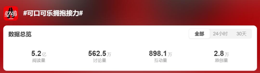 在话题下,赛后,孙颖莎、王楚钦等品牌签约选手第一时间分享了自己的拥抱时刻。杨洋、汪苏邈等明星也加入了话题,促进了更多普通用户的参与。据统计,在整个奥运会期间,可口可乐已经发布了267多个即时内容,至少有385万人参与了“拥抱接力”,捕捉到了136名运动员的拥抱时刻。