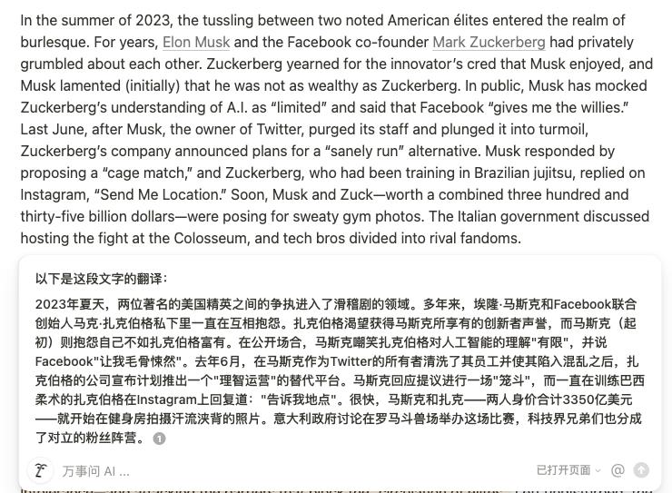 这样做的好处是,用户可以「贪得无厌」,从段落中直接重新唤起 AI 助理,完成翻译或总结,提炼工作。