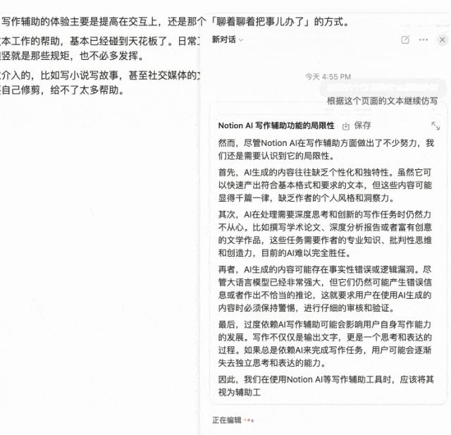 Notion 总是喜欢强调自己在写作任务方面的优势,尤其是加入。 AI 之后,只差一把「如有神助」打在公共屏幕上。在这次升级中,写作辅助的感觉主要是在互动中提升——还是那个?「聊着聊着把事情做好」的方式。