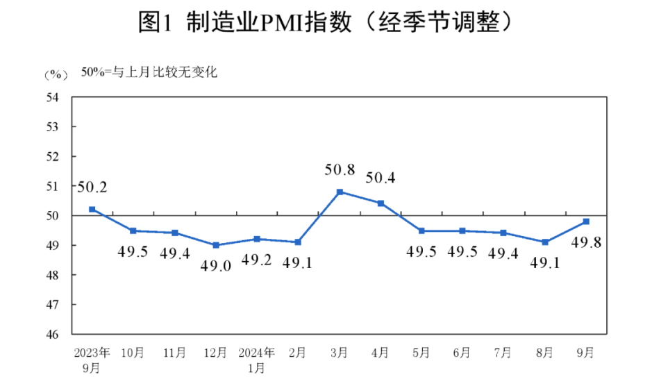 九月三十日,国家统计局发布的数据显示,九月,制造业采购经理指数(PMI)与上个月相比,49.8%上升0.7%,制造业景气度回升。九月份,非制造业商业活动指数为50.0%,较上月下降0.3%。%,非制造业形势水平略有下降。九月份,PMI综合产出指数为50.4%,比上月上升0.3%。%,表明国内企业经营活动整体扩张加快。