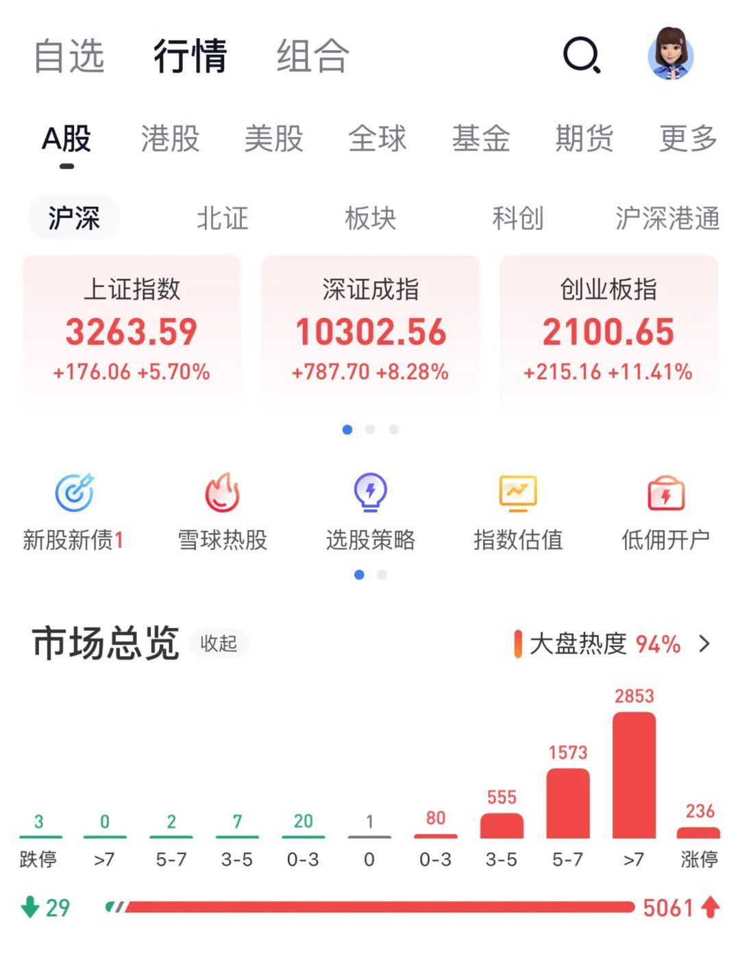 三大指数集体暴涨的情况比较少见,持续暴涨的情况比较少见!今天三大指数继续猛拉,创业板指数再涨10%以上!上周五市场继续上涨。截至发稿,市场上有5000多只股票上涨,绿色股票不到30只!