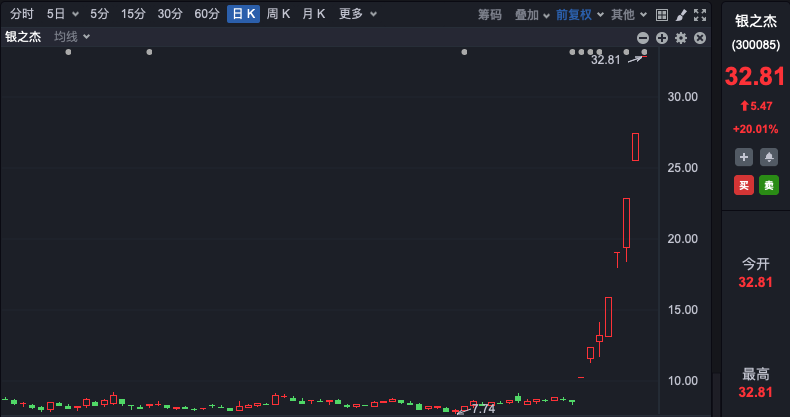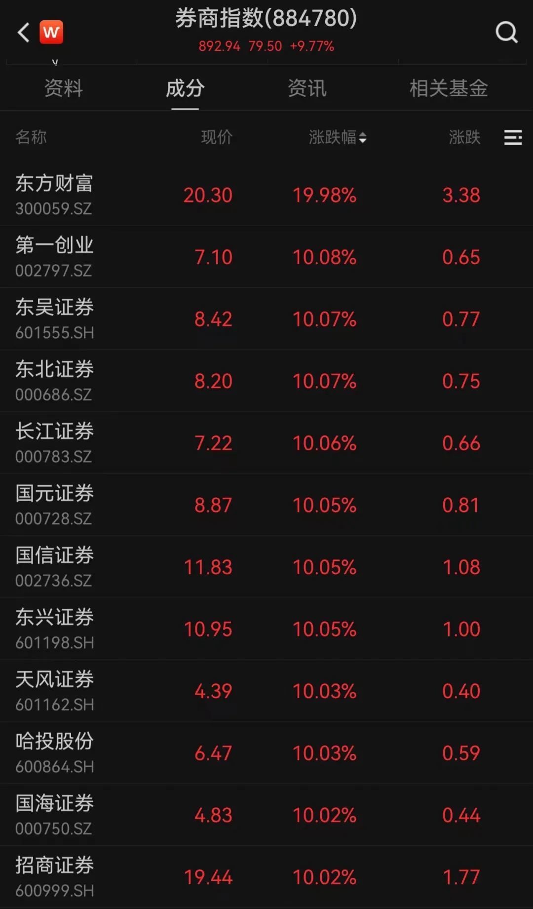 该板块近90%的股票涨停,其中中信证券、TF证券、中银证券、国海证券等多芯股以涨停开盘,涨幅最小的湘财股票也涨了9.75%,相差2分钱。