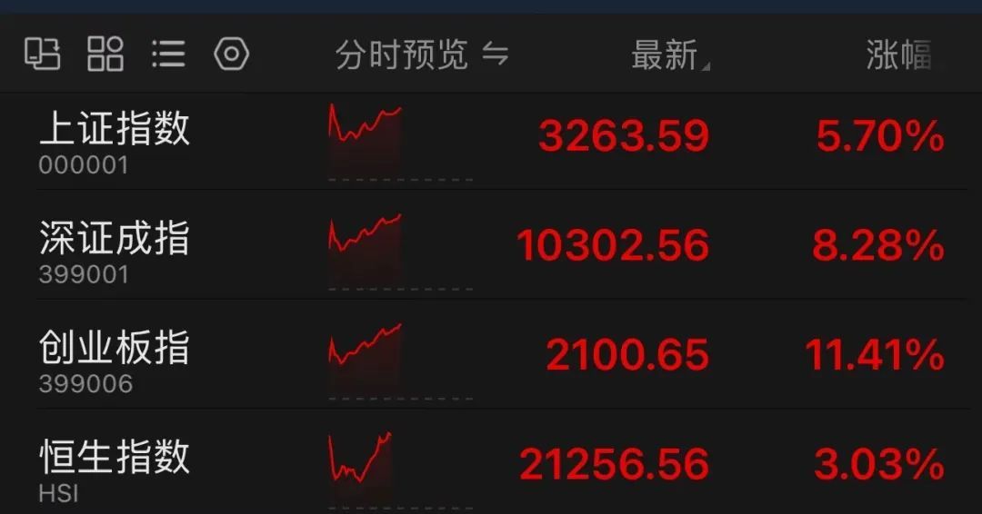 科技50指数飙升13.65%,创历史最高单日增长,半日成交额超过历史最高单日成交额;创业板指数也飙升11.41%,半日成交也接近昨天刚创下的历史记录。