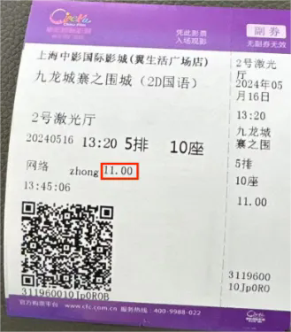 在电影票价标注方面,线下观察数据显示,330个样本包含42个样本,实际支付价格与电影票面价格不一致。观察人员通过淘票平台购买的上海中影国际影城(翼生活广场店)电影票面上没有“票价”二字,只有“11.00”二字疑似票价。但观察人员网上购买的电影票原价为51元,扣除优惠后实际支付40.9元。