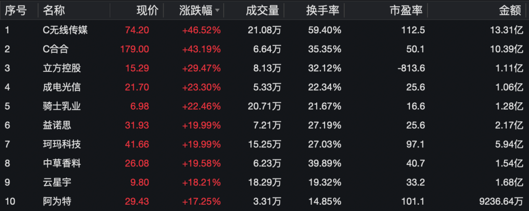 同时,其他次新股的表现也非常亮眼。Wind次新股指数暴涨超过11%,其中C合合、C无线均暴涨超过40%,立方控股、成电光信、骑士乳业均大幅上涨。