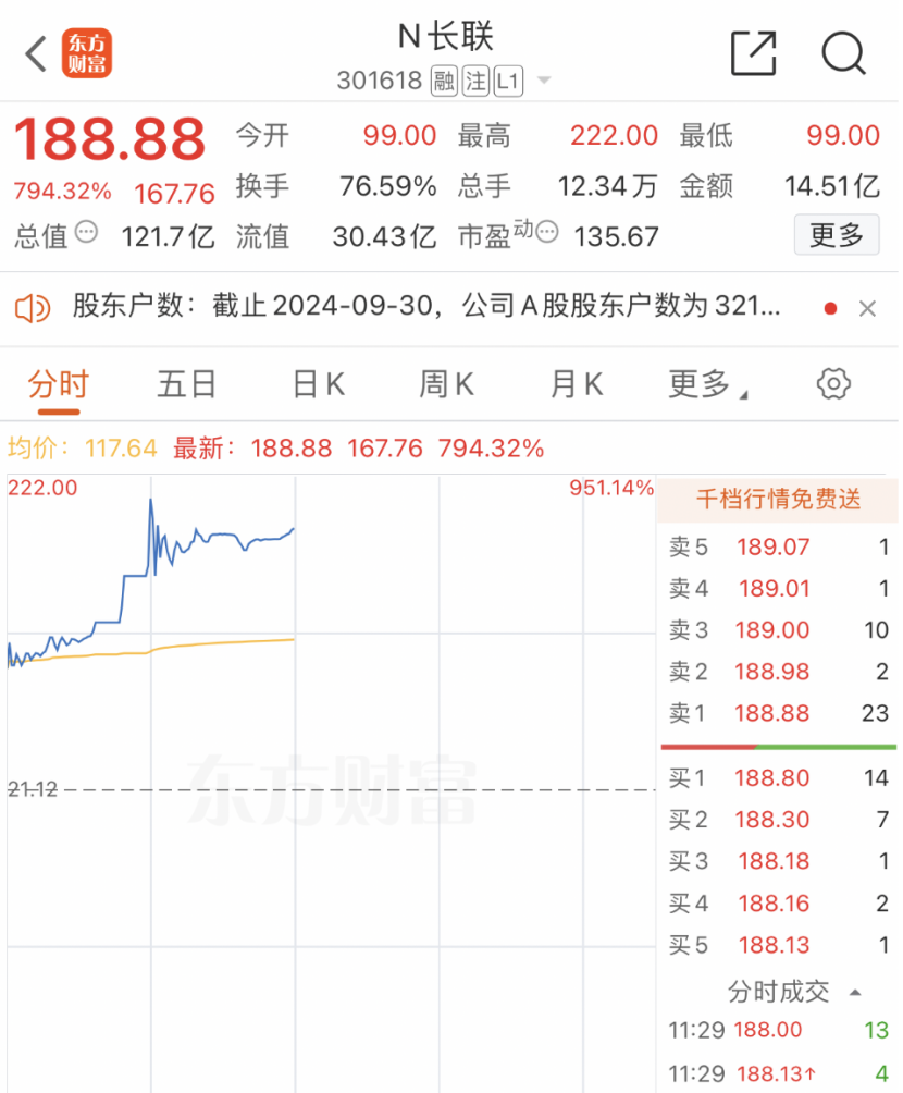 a股市场的多头资金疯狂涌入新股。今天开盘后,次新股大幅上涨。N长联(301618)一度暴涨950%以上,两次暂停。截至中午收盘,涨幅仍高达794.32%。