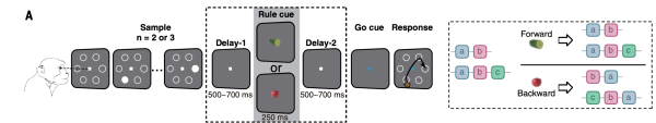 在这项研究中,两只猕猴被训练执行延迟序列排序任务。他们需要记住不同序列位置出现在屏幕上的圆点图案,然后在系统提示下对序列进行正反排序,最后通过触摸屏报告结果。研究人员将微驱动电极阵植入猕猴的前额叶皮层,记录数千个神经元的电活动,并描述结果,分析其表现方法。