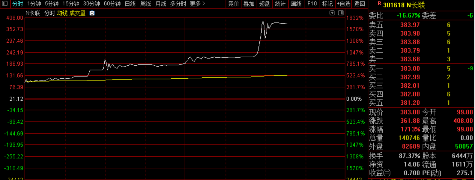 今天开盘后,次新股盘大幅上涨,N长联盘一度暴涨超过1800%,截至发稿,涨幅仍高达1713%。