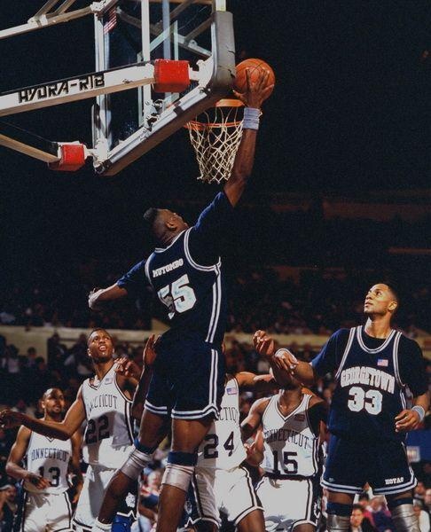 穆托姆博和阿朗佐·1988-1991 · 在乔治城大学与莫宁合作三年,成为当时的一员。 NCAA 最令人生畏的内线组合。