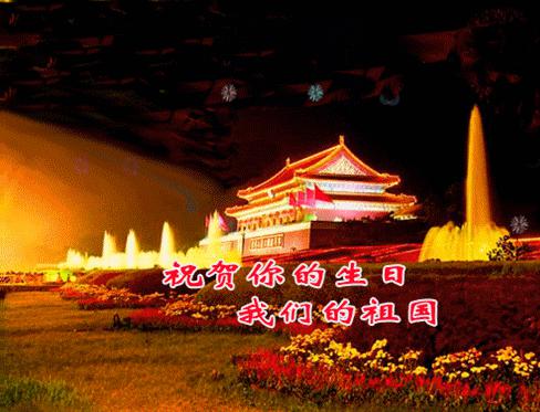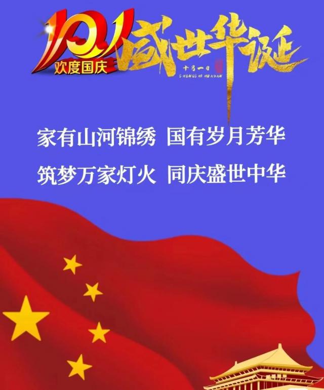 吉祥花瓣盛开,金秋十月国庆来了;全国齐声祝贺,千秋万代福无边;山川丰富,人喜气洋洋,灯笼高高挂满;不停地唱歌跳舞,享受盛世的美好时光;红歌频繁赞美祖国,国运永远繁荣;祝你国庆快乐,幸福快乐!