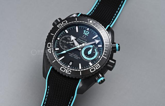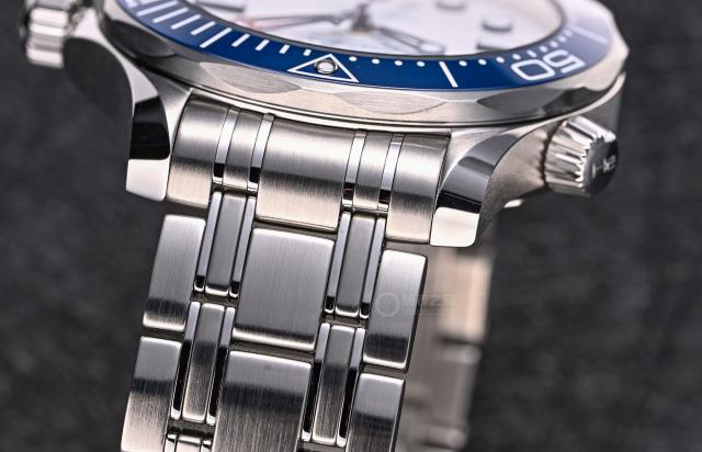 手表配有刚性表链,欧米茄还提供蓝色橡胶表带样式。欧米茄还为手表采用了全新的专利表带快速拆卸系统。一个小按钮可以让佩戴者一键轻松更换表带。