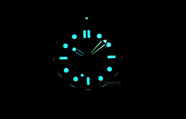 指针时标,以及表圈 12 点的刻度标记,均涂有白色 Super-LumiNova 夜光涂层。上图是手表的夜光拍摄效果。可以看出,为了让佩戴者在水下等昏暗的环境中更好地识别时间,表圈上的夜明珠和分针都有绿色的夜光效果,与其他时标指针的浅蓝色夜光形成鲜明对比。