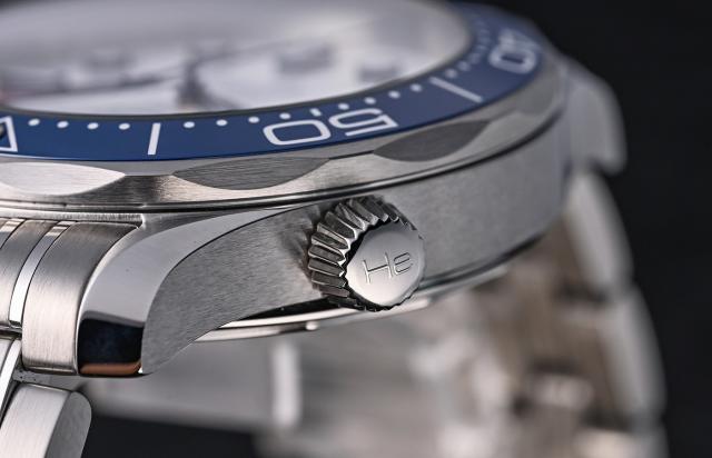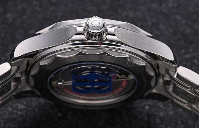 刚性表壳的表径为 42 mm,厚 13.7 mm,属现代潜水表常规范畴。精刚壳在装饰上,欧米茄以拉丝为主,在壳体与表耳棱角的边缘辅以打磨抛光,一明一暗更换,拉起整个表面的奢华感。而且表面的拉丝装饰,从实用的角度来看,也会起到遮盖毛划的作用。表壳这一侧的旋紧式表把,由两侧护肩保护,在潜水过程中,由于意外磕碰而导致表把拧开的可能性降低。