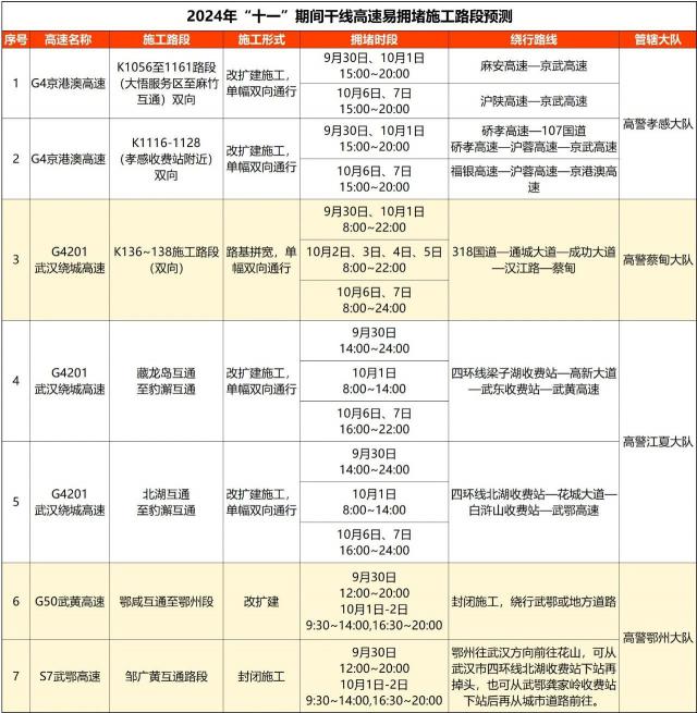 北京港澳高速公路九里关至孝道交流段,由于四改八改扩建,双向路面远距离单道交通,交通条件有限。此外,国庆假期出行需求增加,交通流量大,可能导致交通缓慢。许多司机和乘客可以提前绕道。 107 高速到达目的地的省道或武大。