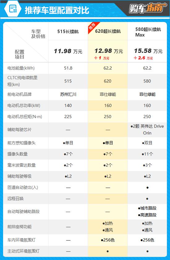 而顶配车型 580 超长续航 Max 与推荐车型相比,辅助驾驶功能主要有所提升,具备城市和高速公路段的自动驾驶辅助能力。对于这种锦上添花的功能,多花点。 26000 很明显,元不划算,性价比也不高。