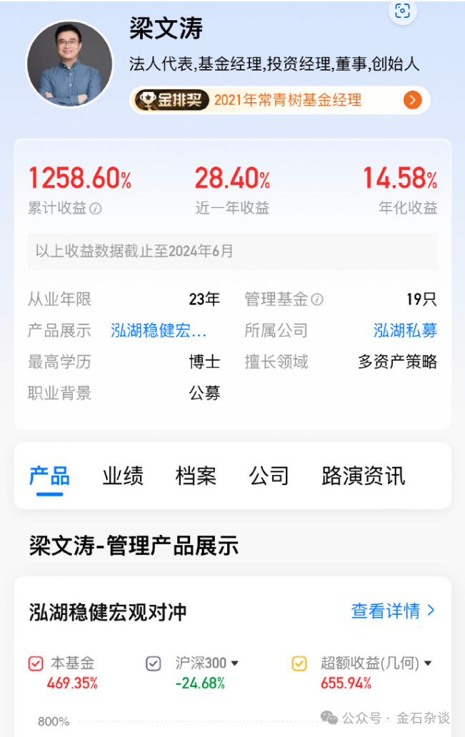 7月份,梁文涛个人业绩及其管理的一项商品业绩曝光,半年来,鸿湖稳健宏观对冲上升40.76%,梁文涛近一年业绩近30%,年化收入14.58%,是一个接近邓晓峰的人。根据最新数据,鸿湖今年稳健宏观对冲增长了50%以上。