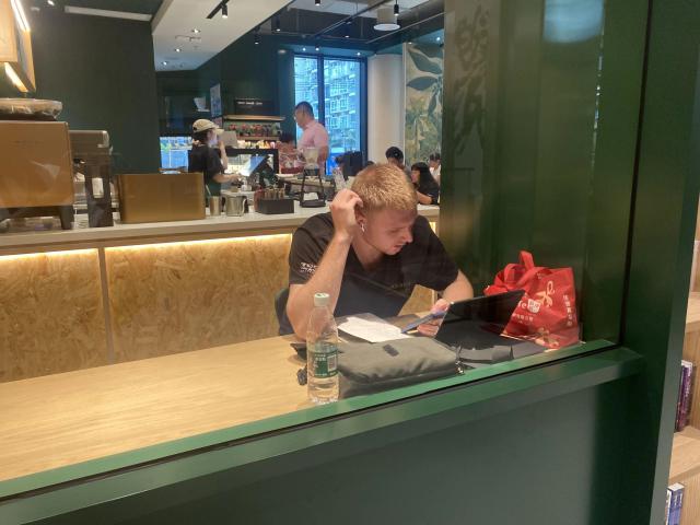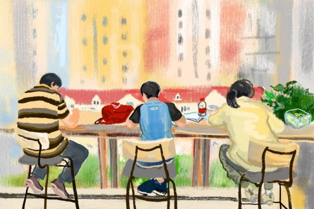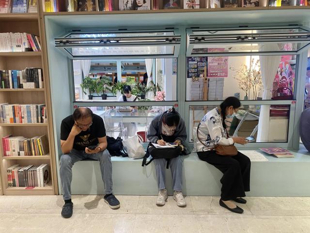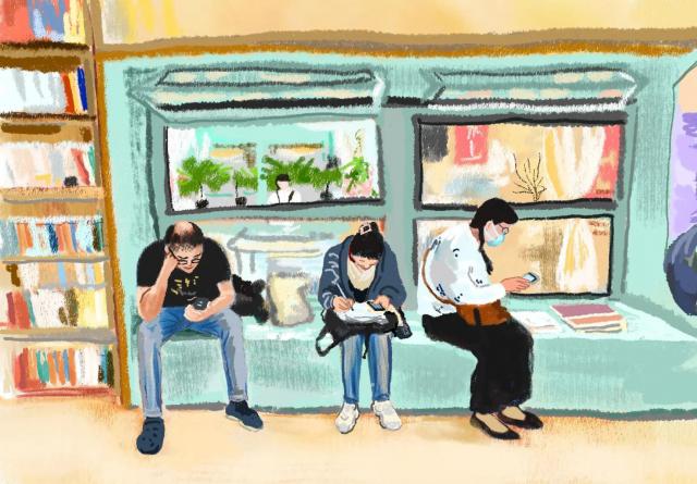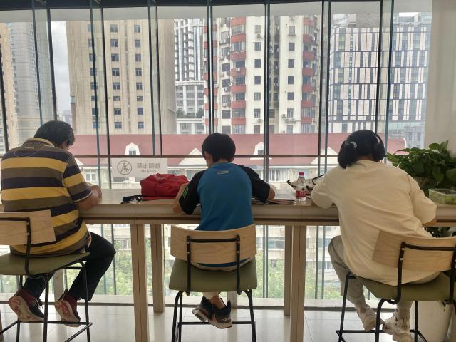 大落地窗前,自习的年轻人和孩子们正专注于阅读。