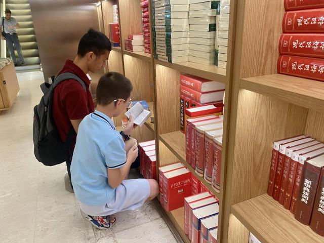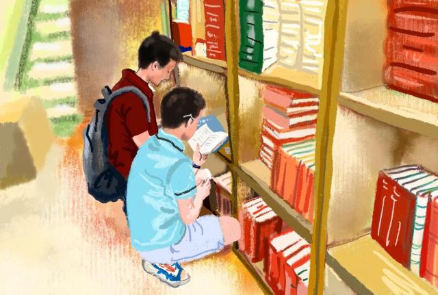 父亲带着孩子在满墙的书前选择合适的参考书。在这里,一切都很安静,但知识让这里按下了“静音键”。沉默中,一切都有条不紊地进行着。