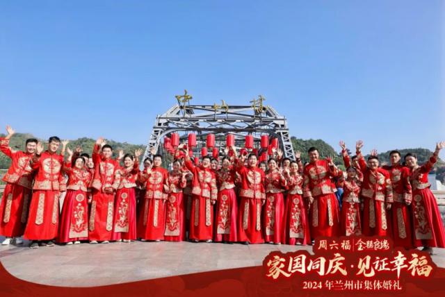 在黄河铁桥上,百对新人穿着优雅华丽的红色服装举行集体婚礼。