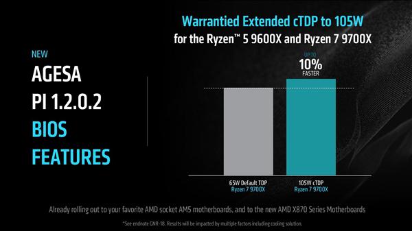此外,AGESA PI 1.2.0.2 微代码版本也正式解锁锐龙 5 9600X、锐龙 7 9700X 热设计功耗的限制,从原来的 65W 开放到 官方估计105W最多可以带来。 10%性能提升。