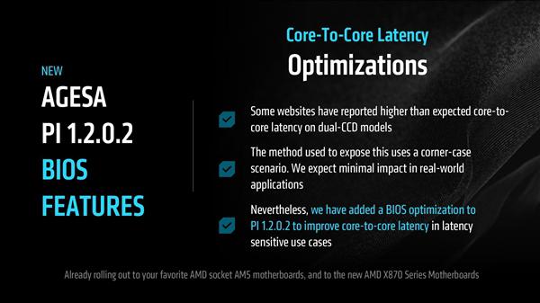 目前,AMD 已正式发布 AGESA PI 1.2.0.2 包括版本的微代码 X870E/X870 在内的全系 AM5 可以刷新主板 BIOS,减少核心间延迟。
