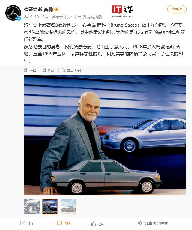 IT 世家 10 月 1 日消息,梅赛德斯 - 奔驰昨日(9 月 30 日(日)发布φ告,梅赛德斯 - 布鲁诺,奔驰传奇设计师・萨科(Bruno Sacco)于 2024 年 9 月 19 日本死于德国辛德芬根,享年享年。 90 岁。