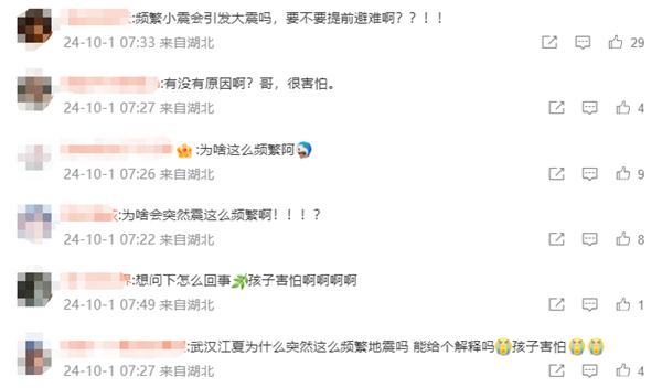有网友在湖北省地震局官微下方留言问:“为什么突然地震这么频繁?”“频繁地震会引起大地震吗?你想早点避难吗?”等等。