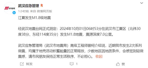 快科技 10 月 1 据《湖北省地震局》官微消息,10 月 01 日 06 时 53 湖北省武汉市江夏区 ( 北纬 30.38 度,东经 114.35 度 ) 发生 M1.8 级别地震,震源深度 7 公里。