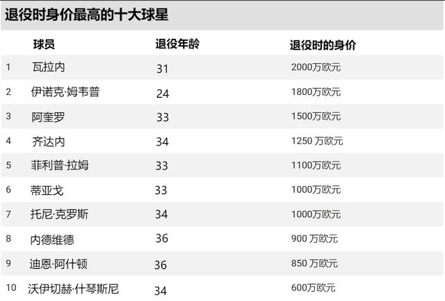 最近,《转会市场》(Transfermarkt)在最近宣布退役的瓦拉内排名第一的比赛中,发布了一份身家最高的球员名单。