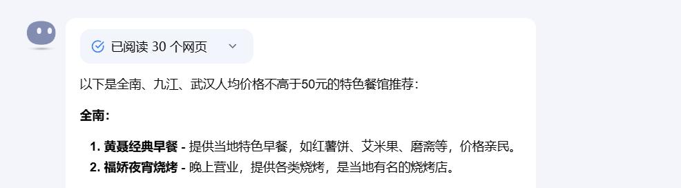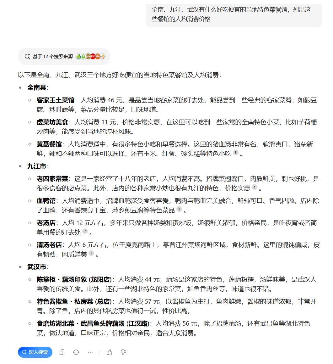 充分考虑,老狐选择广州→全南→九江→武汉→十堰这条路线,再根据路线,使用 AI 推荐适合当地打卡的店铺。 ,这里,Kimi 豆包和豆包的表现还是比较出色的,2个 AI 提及同一家店——全南的“黄聂餐厅”。