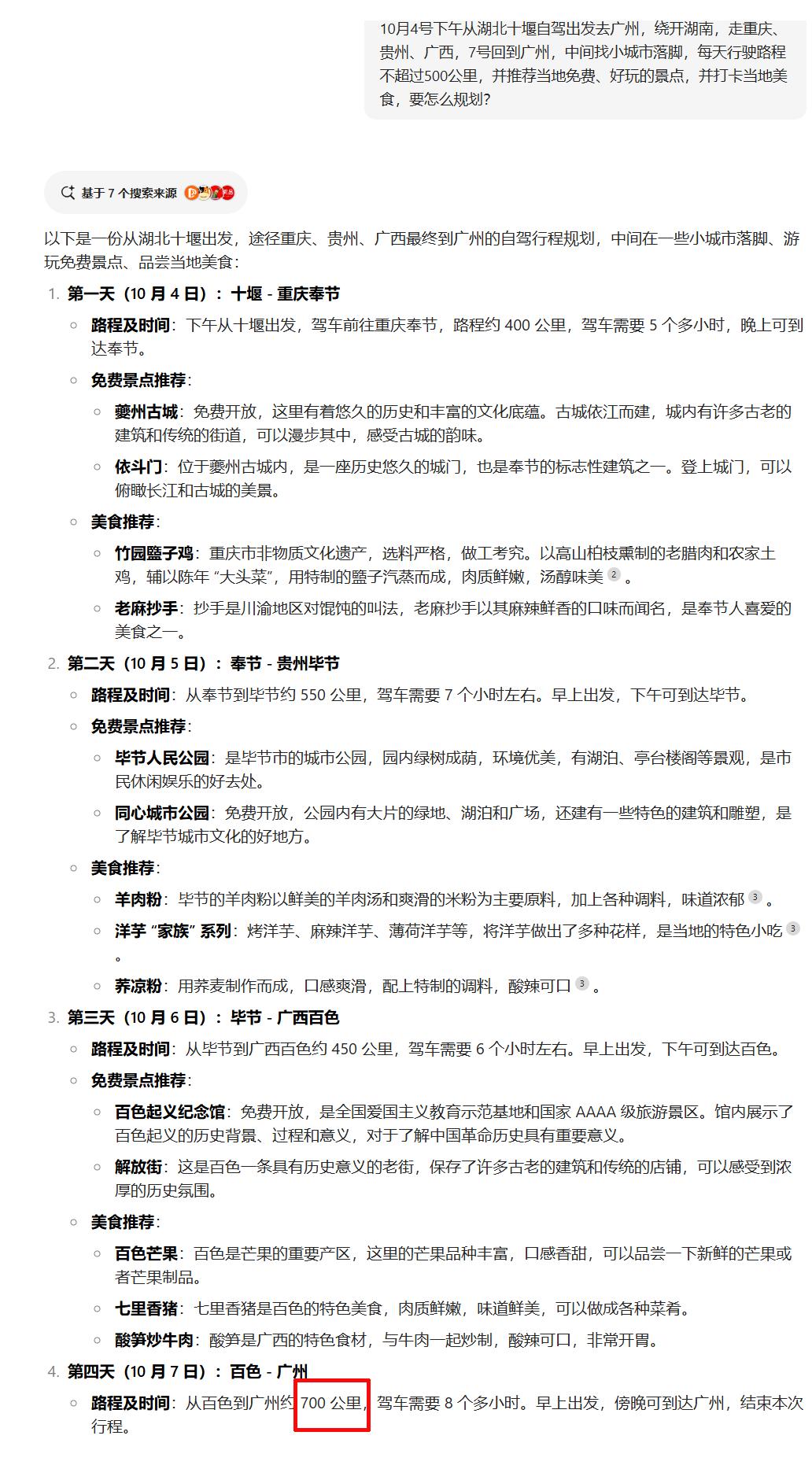 豆包表现稍好,被识别为“小城市”,所以建议落脚点是奉节、毕节、百色,但距离不够。 500 公里需求,最后一段百色到广州达到 700 公里。