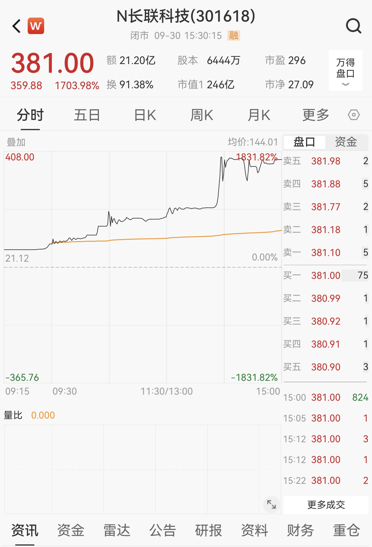 长联科技(301618)在这一天上市.SZ)不但以1703.98%的涨幅成为当日涨幅最高的股票,也创下了今年新股上市首日单日涨幅最高纪录。长联科技发行价格为21.12元/股,当日以99元/股的价格开盘,盘中最高涨至408元/股,截至收盘报381元/股。如果以中一签即500股计算,中标该股的投资者将拥有该股至收市,利润约为17.99万元。