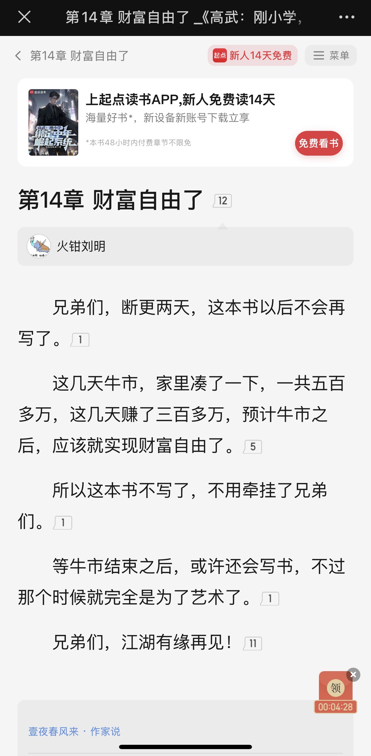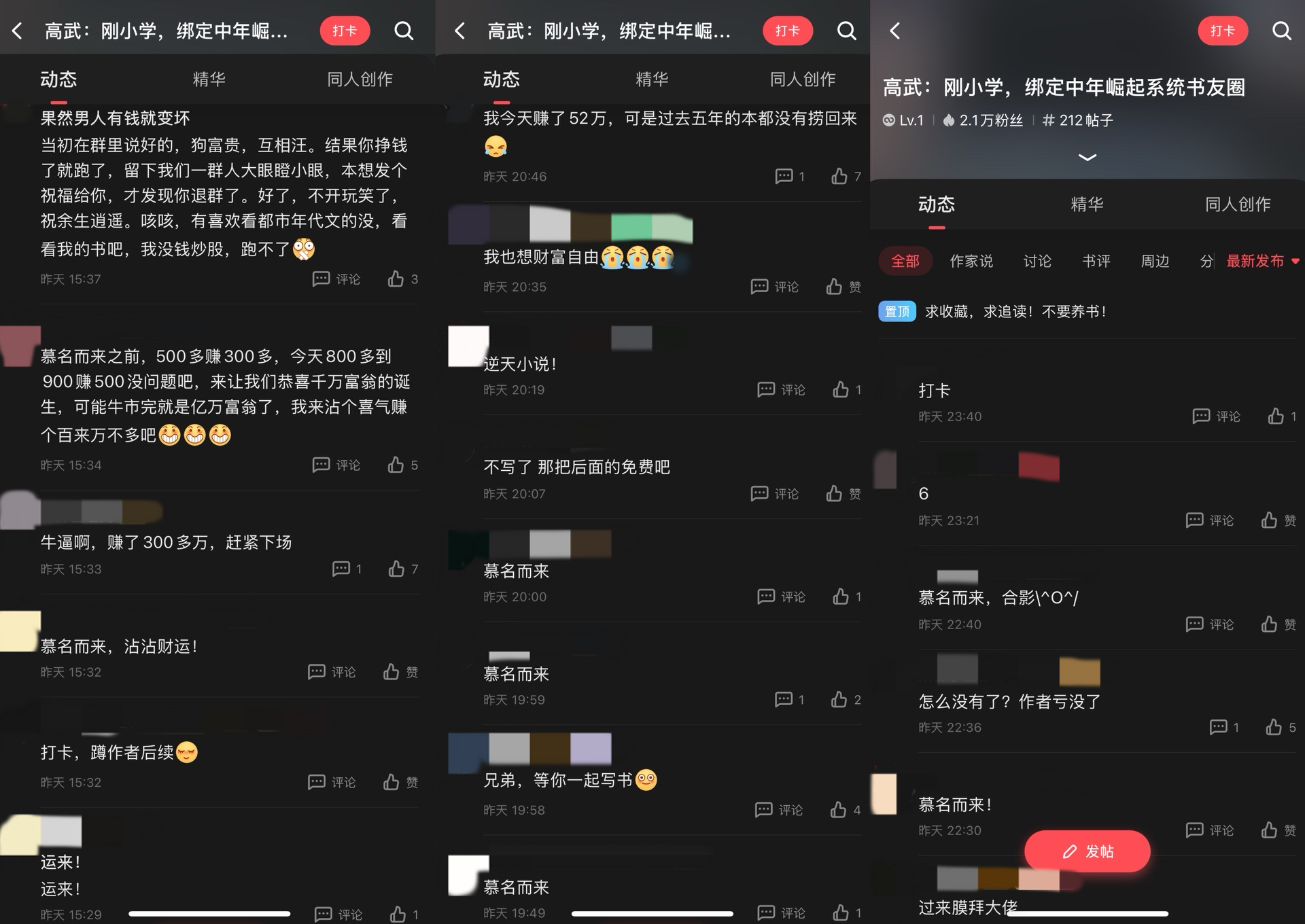 更有甚者,网络小说的作者直接“断更”:他说:“这几天赚了三百多万,估计牛市之后,应该实现财富自由。所以这本书不写,不用担心兄弟们。”