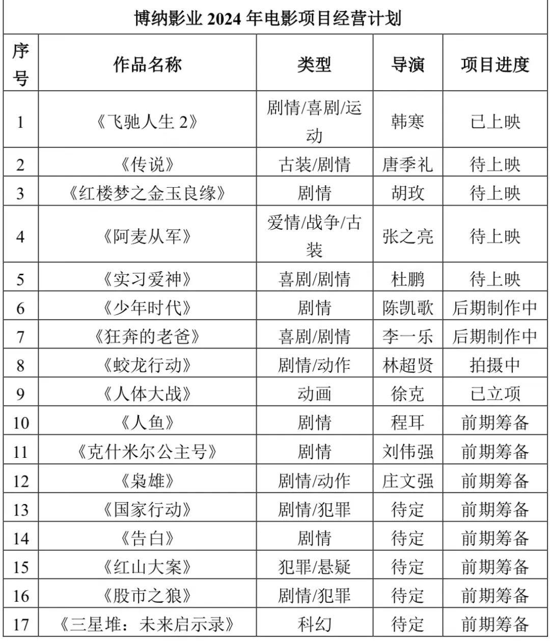在最近的“投资者交流”中,博纳回应称,在2023年电影观众爱好发生变化后,公司管理层及时总结讨论,暂停了一些不再合适的电影项目,开始了一些新项目。其中,克什米尔公主预计今年下半年开播,2.5亿投资的电视剧《上甘岭》预计今年播出。