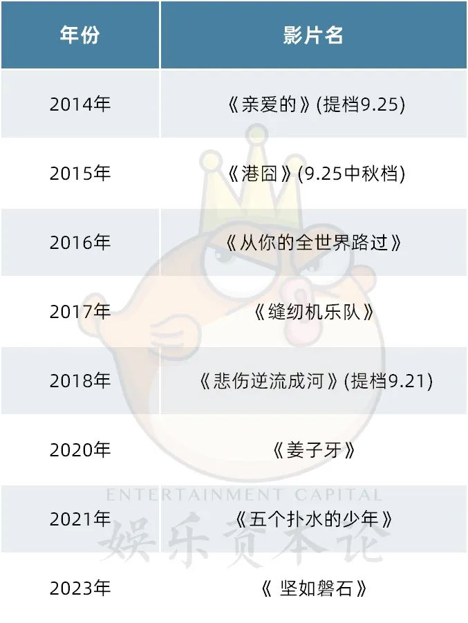 2014年国庆前夕,光主投和陈可辛执导的《亲爱的》获得了极好的口碑,宣布9月25日备案,提前点燃国庆档。第二年,光主投控制的《香港》定于9月25日中秋。那一年,中秋节和国庆节的时间表非常相似。这部电影在中秋节的时间表中排名第一,在国庆期间也获得了近5.5亿元,与时间表冠军夏洛特的苦恼相差不到1000万。