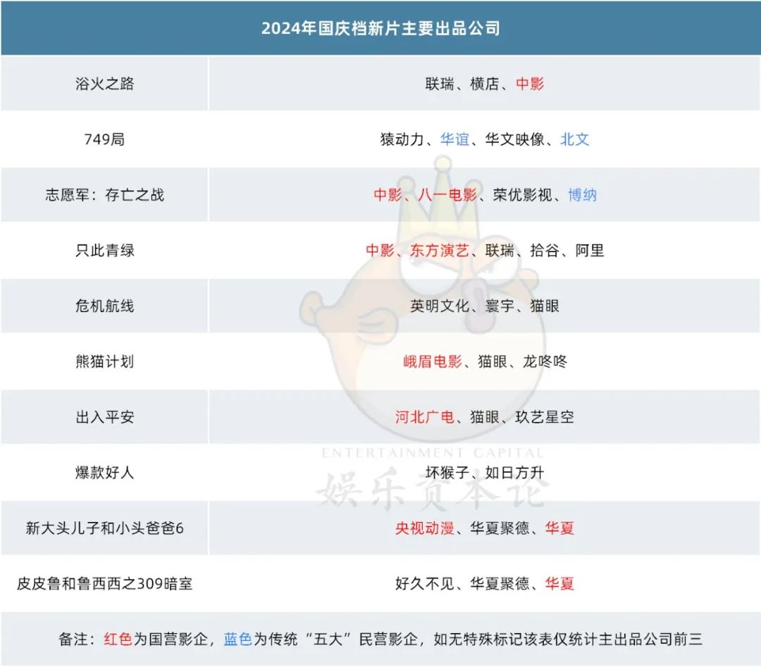 纵观今年国庆档出品公司的格局,最明显的趋势是:头部公司不再进入。