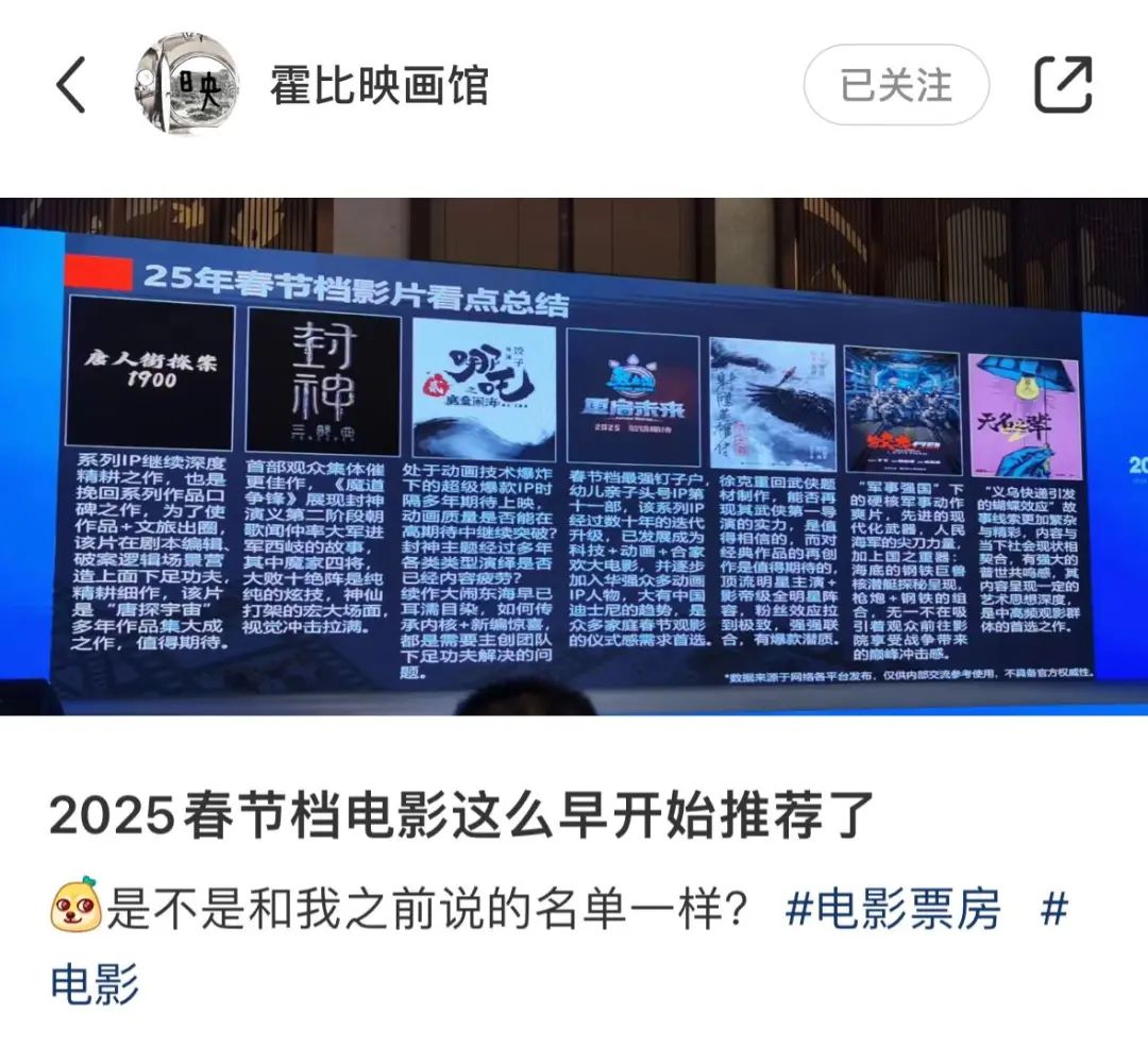 《唐人街探案1900》(万达)、《封神第二部》(阿里)、《哪吒的魔童闹海》(光)、《射雕英雄传》(中影、联瑞)、《蛟龙行动》(博纳)、《无名之辈2》(上狮)、《熊出没重启未来》等七部电影在25年春节档电影的看点总结中出现。没有人能在暑假或者这个国庆节和你见面。
