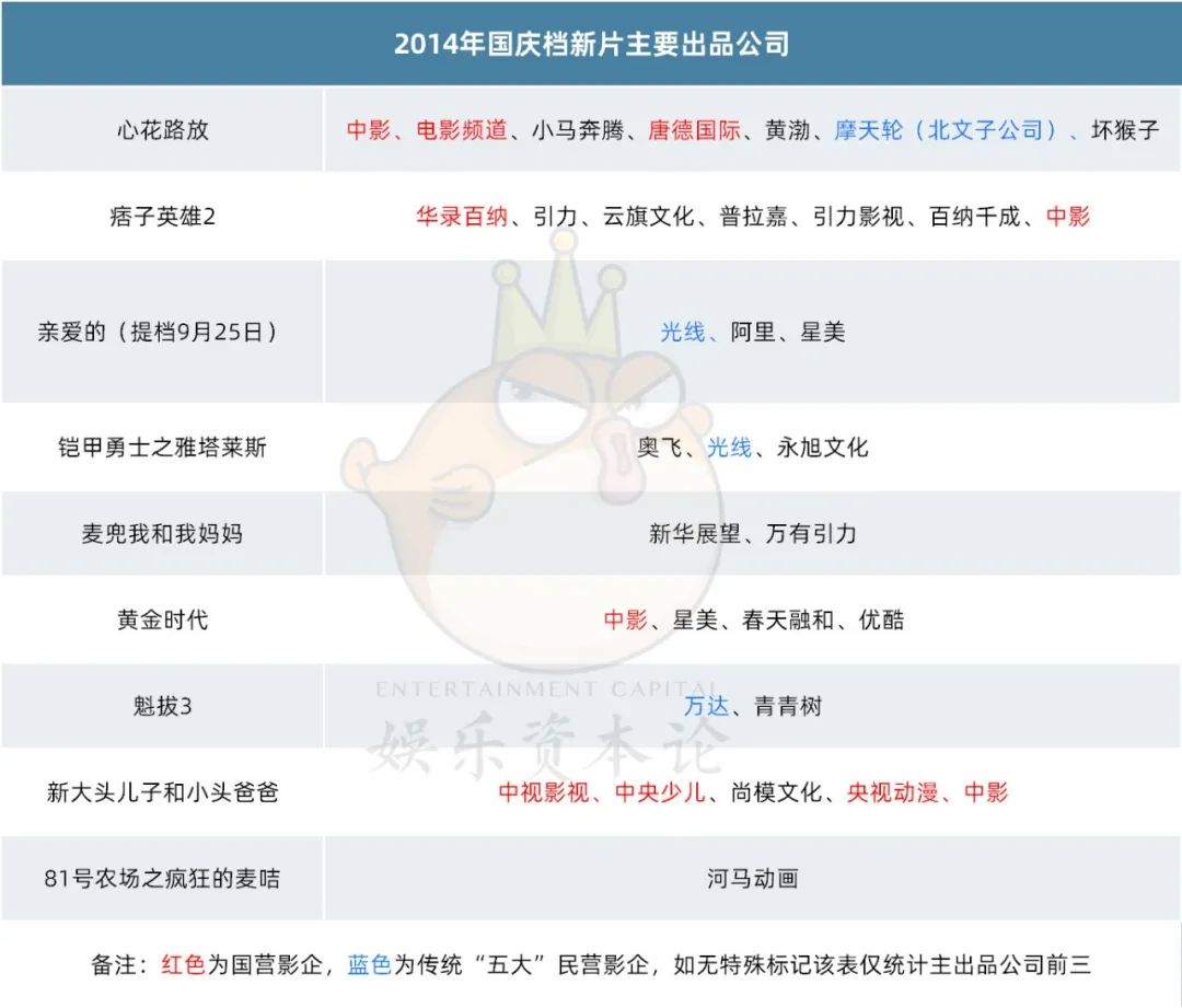 2014年,国庆总票房首次超过10亿,春节、暑假、国庆的格局逐渐确立。也是在那一年,民营电影公司五大(或加乐视六大)的概念开始流行起来。
