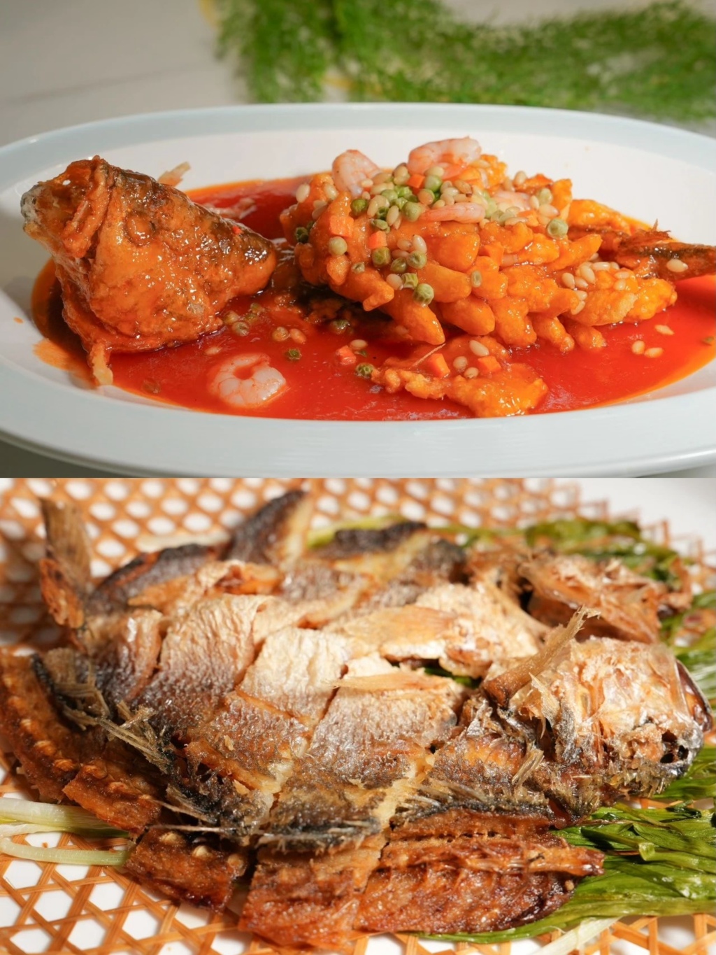 沙司黄鱼(上)葱香黄鱼(下)