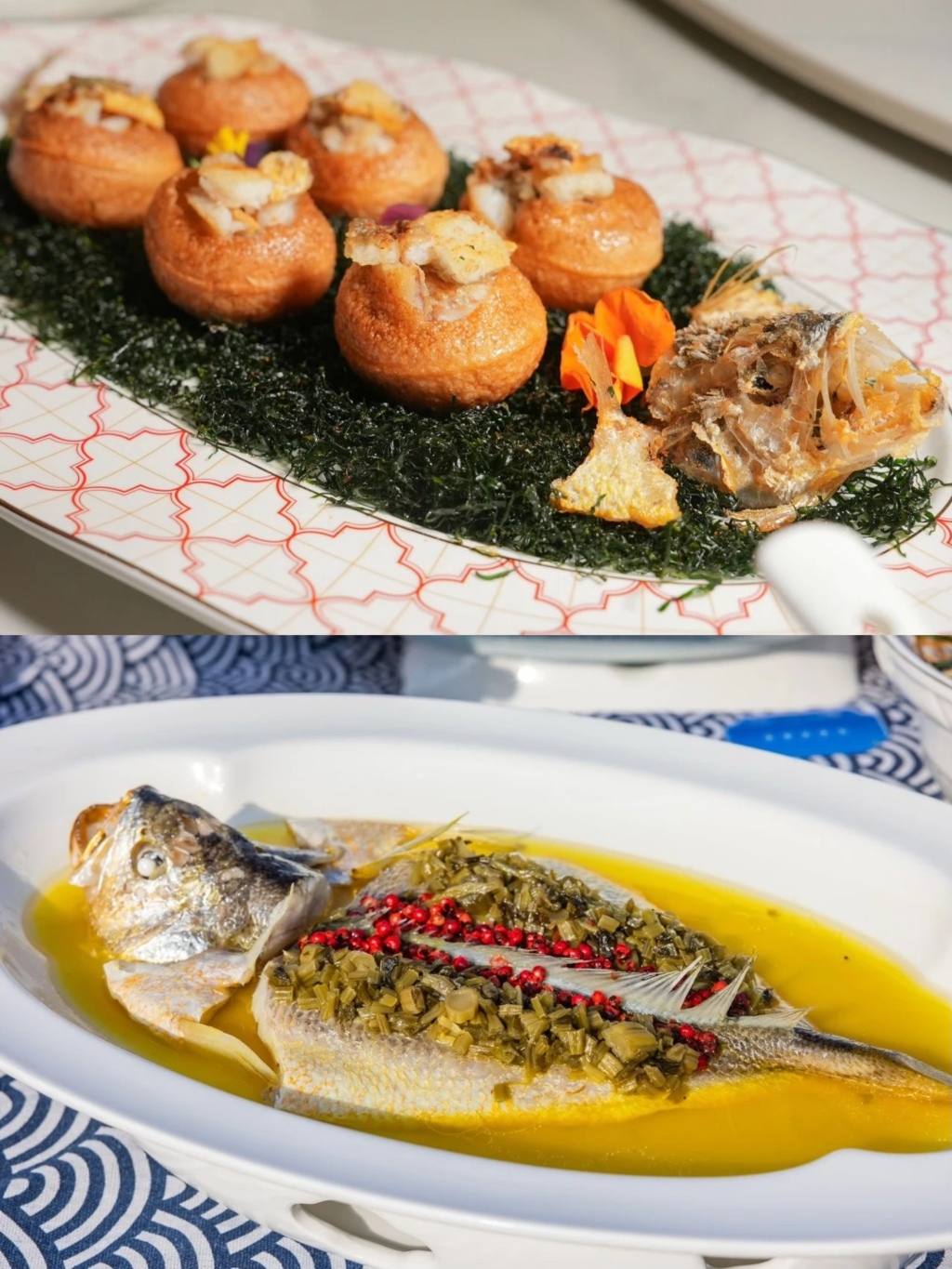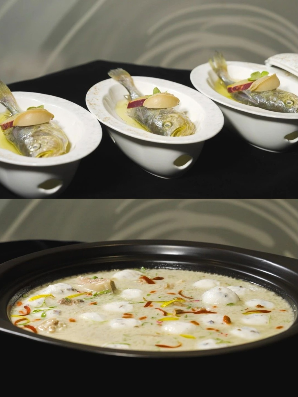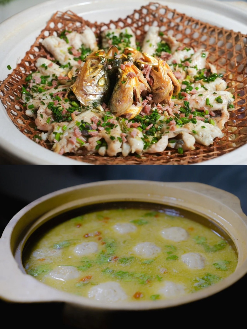 黄鱼砂锅烤(上)黄鱼狮子头(下)
