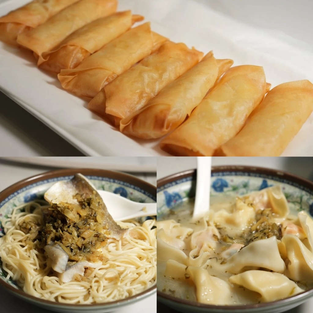黄鱼春卷(上)黄鱼面(下左)黄鱼馄饨(下右)