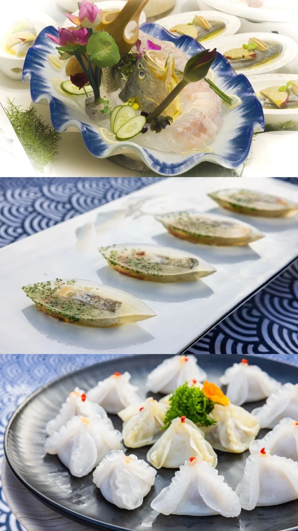 低温捞石首鱼(上)黄鱼冻(中)香煎黄鱼饺(下)