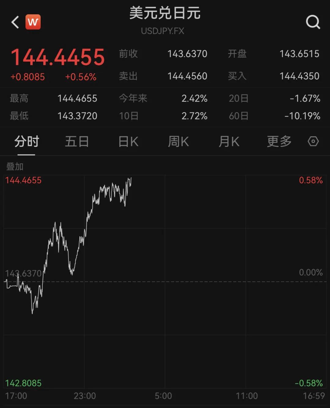 截至发稿时,美元兑日元突破144,现在上涨0.56%。