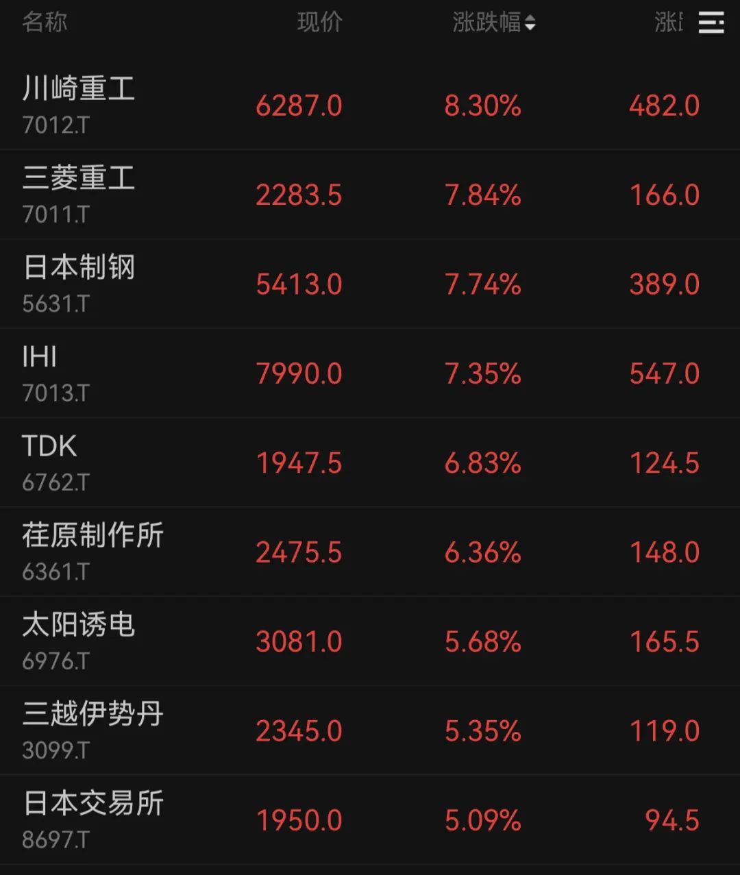 成份股中,川崎重工涨幅超过8%,三菱重工涨幅接近8%,日本交易所涨幅超过5%,软银集团涨幅超过3%。