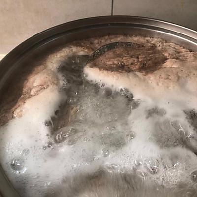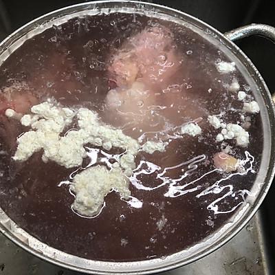3、将洗好的带骨牛排放入锅中,加入纯净水吞没带骨牛排(注意:加入冷水不能加热水,加入热水肉会变红,里面的血水不会干净)煮沸去除血沫。